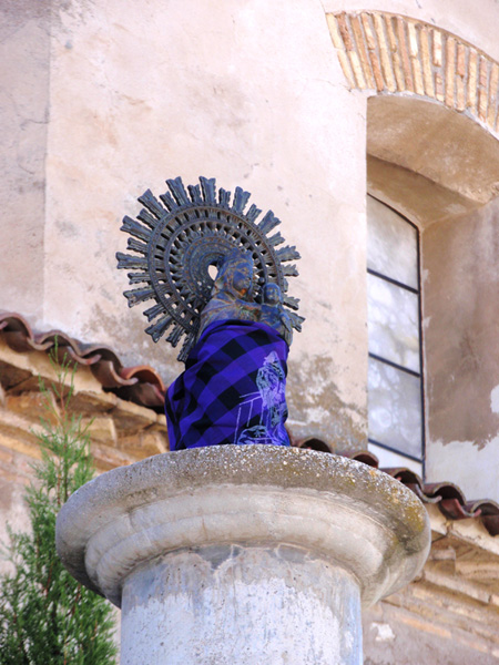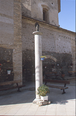En realidad se trata de una columna toscana, quizá fechable en el siglo XVI y procedente de un edificio histórico, sobre la que se ha colocado una pequeña imagen de la Virgen del Pilar.