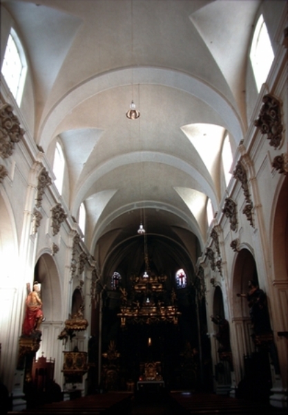 La nave central, mayor en altura y anchura que las laterales, se cubre mediante bóveda de medio cañón con lunetos, al igual que aquellas. Los arcos perpiaños se apoyan en pilastras, sobre las cuales se disponen peanas voladas que sirven de base a las estatuas de los apóstoles.
