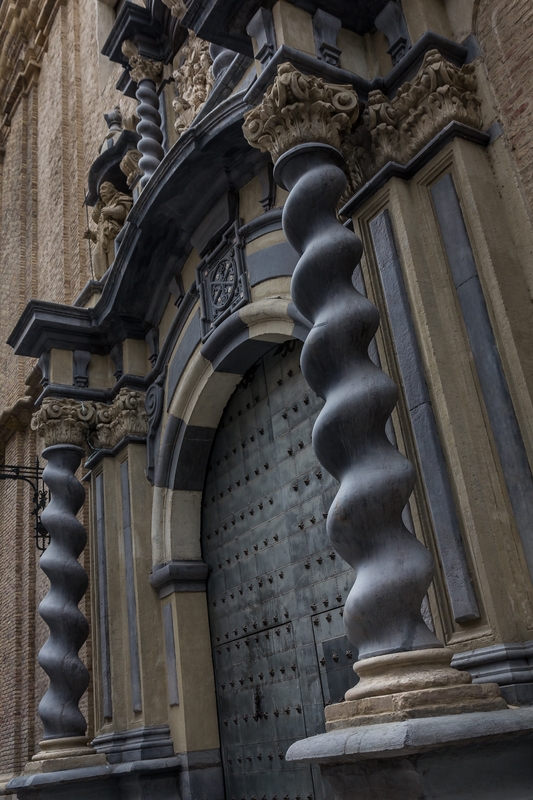 La fachada, de dos cuerpos, está construida con ladrillo: el inferior consta de una portada de medio punto flanqueada por monumentales columnas torsas extentas, y el superior luce una cartela central figurativa entre pequeñas columnas torsas del cuerpo inferior. La fachada está coronada por un gran frontón triangular y flanqueada por las torres.